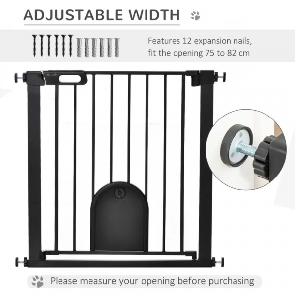Title: – 75-82 cm Pet Safety Gate, Stair Pressure Fit, Auto Close, Double Locking, Black Description: – DOUBLE-LOCKING SYSTEM: Adult can open the door with one hand by sliding the button on the top (Need to slide both ends at the same time and then lift). Comes with the bottom locking block, it enhances the stability, to ensure your pet secured in place. – EASY ACCESS: Equipped with a small cat flap/ door, convenient for pets to pass, it can be kept always open. This pressure fit stair gate is designed to open both direction, you can adjust it to meet your different need. – INSTALLATION METHOD: Wall space pressure mounts for simple set up. Please note, it is normal that there is a large gap at the door lock before installation, just tighten both sides until the gap is 2-3 mm. – AUTOMATICALLY CLOSE DOOR: The walk-through door can be closed automatically when its opening angle is less than 90 degrees, and remain open when it goes over 90 degrees, which can solve the trouble that you occasionally forget to close it. Pet Gate Information: – Ideal for doorways, hallways, stairs, etc. – Our gate only fit the opening 75 to 82 cm, please measure your opening before purchasing. – Assembly required.