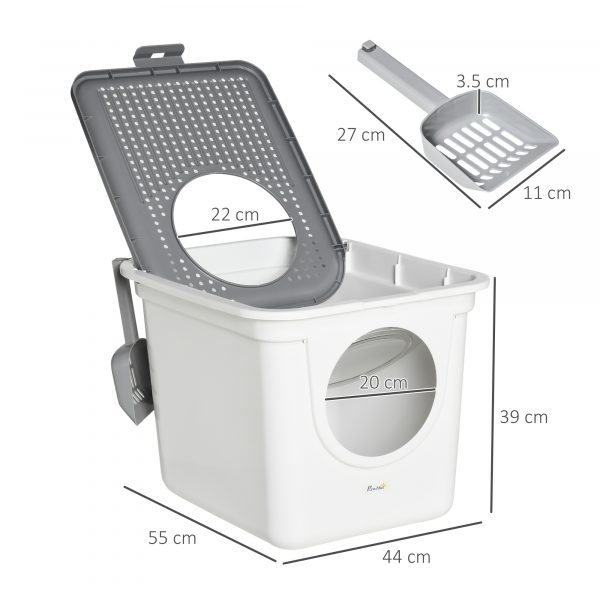 Cat Litter Tray Pet Litter Box Toilet w/ Front Entrance, Top Exit, Scoop – White