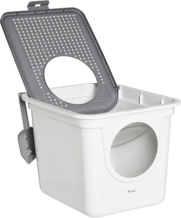 – Cats will enter through the front, then leave from the top, making it easy to get in and out – Enclosed design for privacy and traps unwanted odours – Plastic structure for durability – Includes a scoop and a pull-out tray to maintain the litter box – Top with holes, keeping their space ventilated – Maximum load 5kg, assembly required