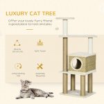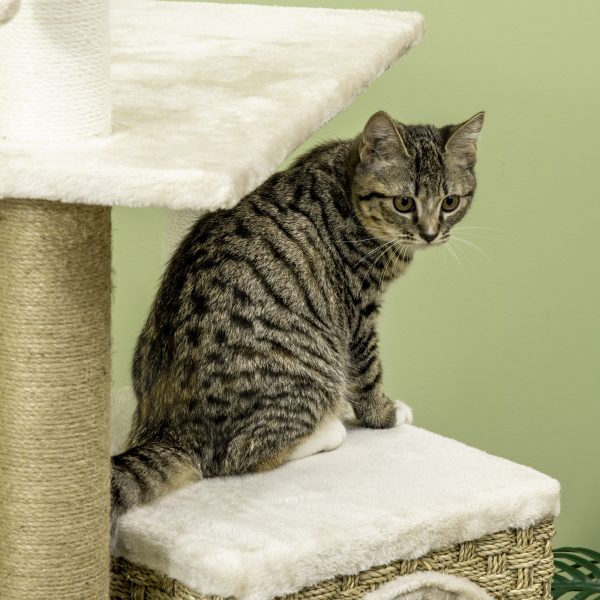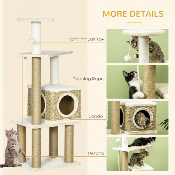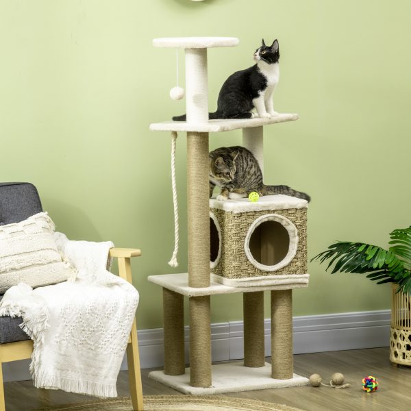 Multiple levels: A spacious cat play tower with different spots, where cats can climb, play and rest. Includes a hanging toy ball at the top to play with, whilst the cat house lets them relax in private.Jute scratching posts: Pets can dig their claws into this cat climbing tower, satisfying their urge to scratch, which deters them from using your furniture.Sturdy and safe: Made from particle board, this cat tower is stable and safe – pets will be properly supported when using.Plush upholstery: A cat tree tower covered in soft material, ensuring pets remain comfortable.Dimensions: 128H x 47.5L x 38.5Wcm. Suitable for cats under 5kg. Assembly required.