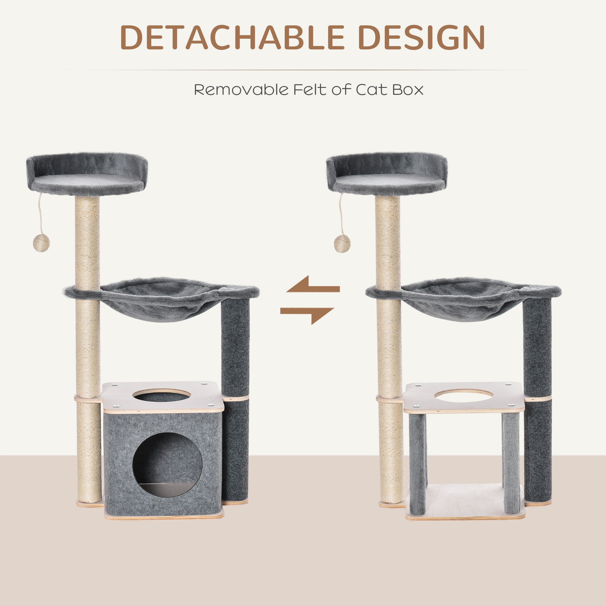 All IN ONE ACTIVITY CENTER: Multi-level cat play tower with sisal rope scratching posts, perches, roomy cat house, cozy cat hammock, cat ball for endless entertainment.SAVING YOUR FURNITURE: With scratch post wrapped with durable natural sisal ropes, the cat towers for indoor cats are perfect to sharpen their claws and save your furniture from scratching and digging.SOFT FABRIC: Covered with soft and comfortable short plush, making this cat tree tower the perfect resting area for your furry friends. And the felt of the condo is removable and easy to clean with hands.STURDY & SAFE: Made of solid particle board to keep the whole cat climbing tower strong, stable, and pet friendly.PRODUCT DETAILS: Overall dimension: 48L x 34W x 95Hcm. Suitable for cats within 4.5kg. Assembly required.