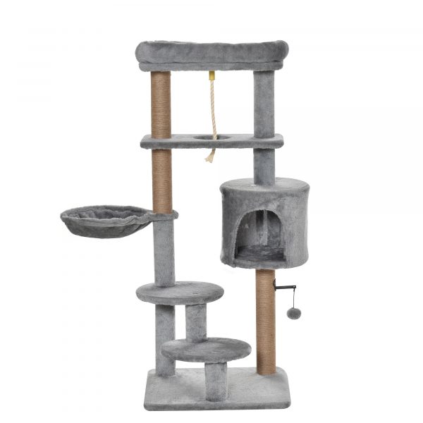 – Features a house, three perches, large top bed, side hammock, teasing rope and a dangling ball