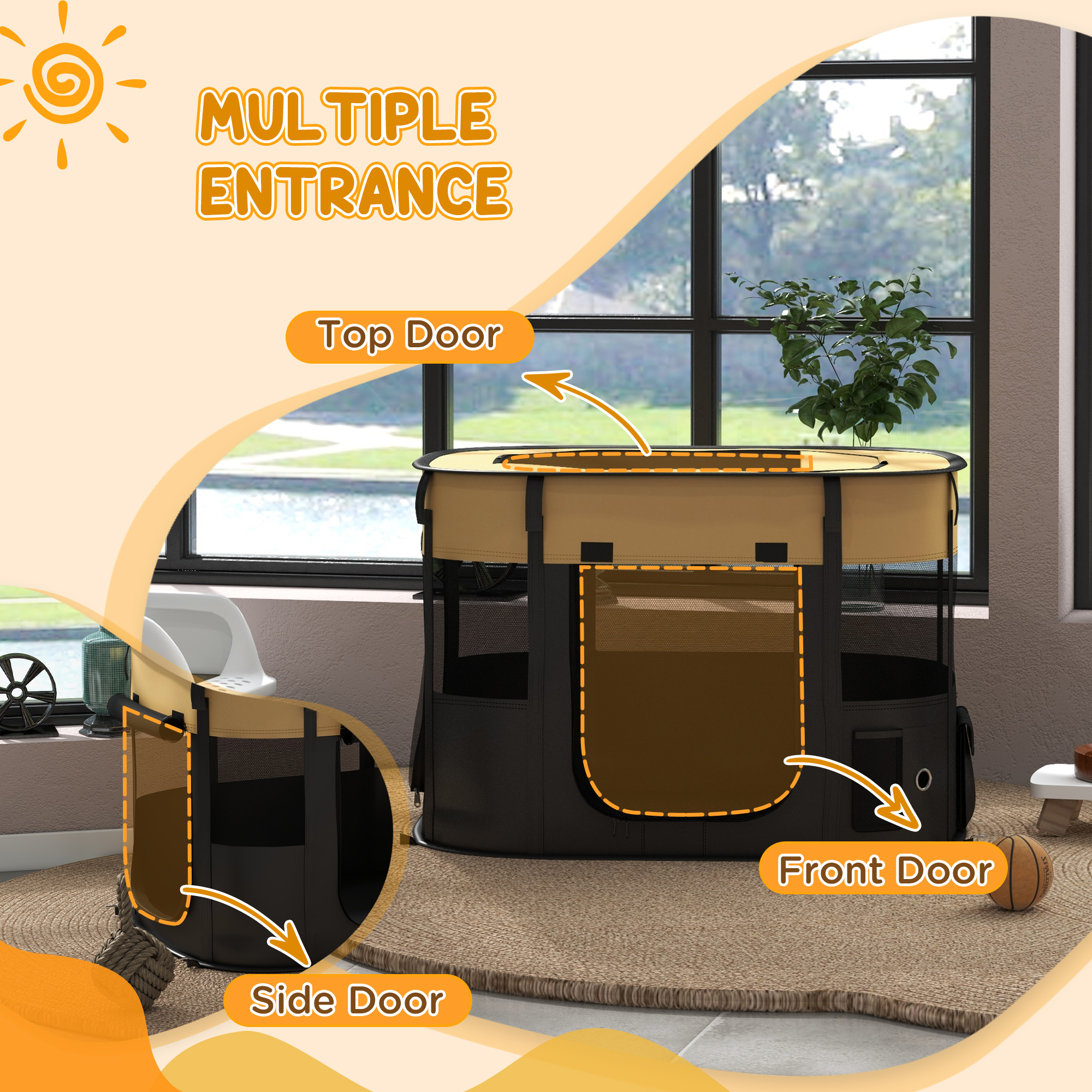 ● Six mesh windows ensure proper ventilation for pets ● Three mesh doors facilitate easy entry and exit ● Foldable design allows for compact storage and portability ● A storage bag provides tidy storage when not in use ● Two storage bags offer storage space ● Four ground stakes provide stability outdoors and indoors ● Suitable for under 10kg small animals ● Assembly required ● Colour: Yellow and Black ● Material: Oxford fabric, Nylon mesh, Steel, Fibreglass pole ● Overall Dimensions: 84L x 64W x 53Hcm ● Foldable Size: 40L x 40W x 8Hcm ● Front/Left Door: 30W x 38Hcm ● Windows: 34W x 17Hcm/37W x 17Hcm/19W x 17Hcm ● Top Door: 57L x 37Wcm ● Item Label: D06-217V01YL