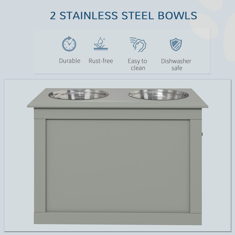 – Colour: Grey – Material: MDF and stainless steel – Dimensions: 41H x 60L x 30Wcm. Bowl platform: 60L x 30Wcm. Bowl size: 7H x Dia24cm. Single bowl capacity: 2L. Storage space: 39H x 58L x 28Wcm. Side handle: 10L x 2.5Wcm – Weight capacity: 30kg – Item Label: D08-021V00GY