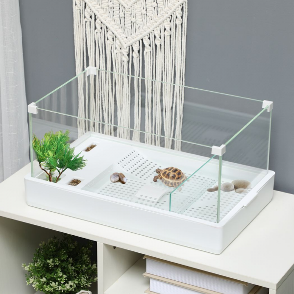 – Heightened glass: The side glass panel is 18cm tall, providing a barrier that prevents pets from crawling out of the turtle aquarium and keeping them safe and secure.