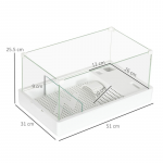 Turtle Tank, Glass Tank with Basking Platform, Reptile Habitat” Description: – Multifunctional: The terrapin tank includes areas for feeding, basking, climbing, diving, swimming, and hatching, creating a comfortable and familiar habitat for pets to thrive. – Easy to clean: The glass tank has a three-layer separation design, allowing for easy removal of waste and food scraps. Simply lift the filtering layer to let them sink to the bottom, then pour out the dirty water from the bottom layer. Pets will always have a tidy home to enjoy. – Four glass panels: The tank is designed with four glass panels that are easy to wipe clean and allow you to watch your pets from all angles without any blind spots. – Heightened glass: The side glass panel is 18cm tall, providing a barrier that prevents pets from crawling out of the turtle aquarium and keeping them safe and secure. – Dimensions: 25.5H x 51L x 31W cm. Ideal for small turtles with a maximum size of 5 cm. Assembly is required.
