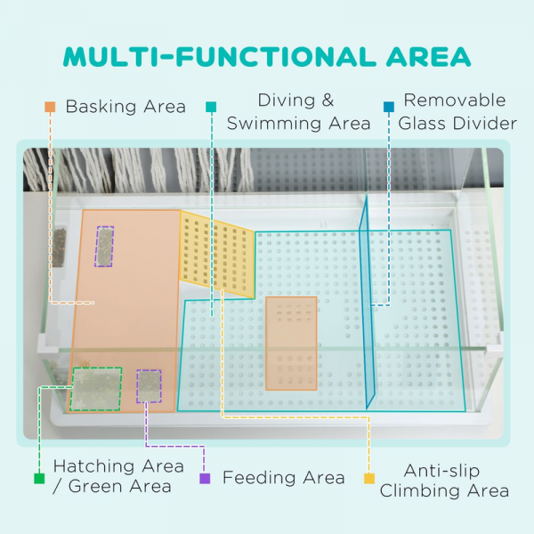 – Multifunctional: The terrapin tank includes areas for feeding, basking, climbing, diving, swimming, and hatching, creating a comfortable and familiar habitat for pets to thrive.
